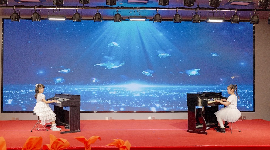 电钢琴《初心与爱同频》:张璟瑜(华鑫洺源公司张路之女)、郑若溪(华鑫洺源公司郑东昊之女)
